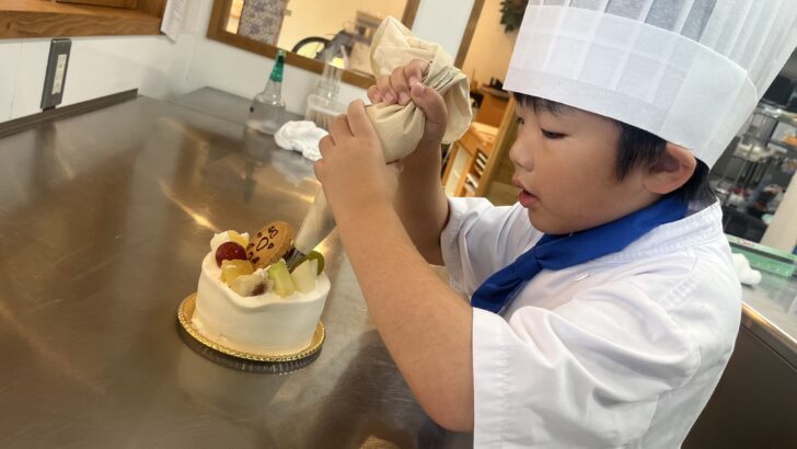 先月お誕生日だったパパにケーキを作りに来てくれたのはあつひこ君8歳😊パティシエ姿がバッチリきまってケーキ作りスタート!いろんなフルーツをどこに飾ろうか考えながらデコレーションする姿がとっても可愛かったです🥰クッキーには自分で考えて飾ったフル...