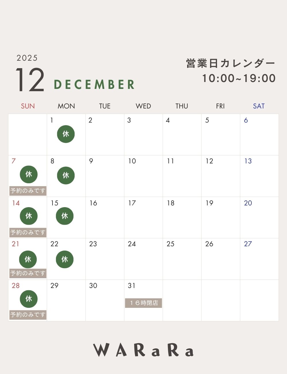 1月の定休日