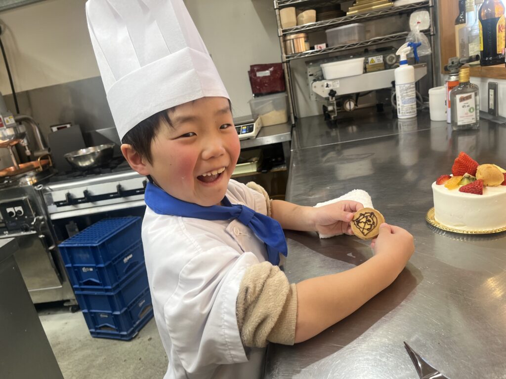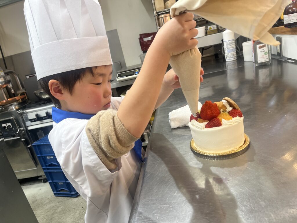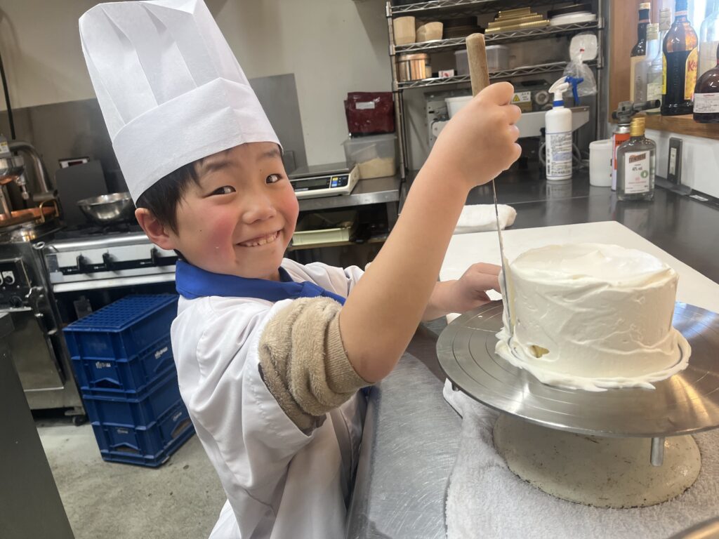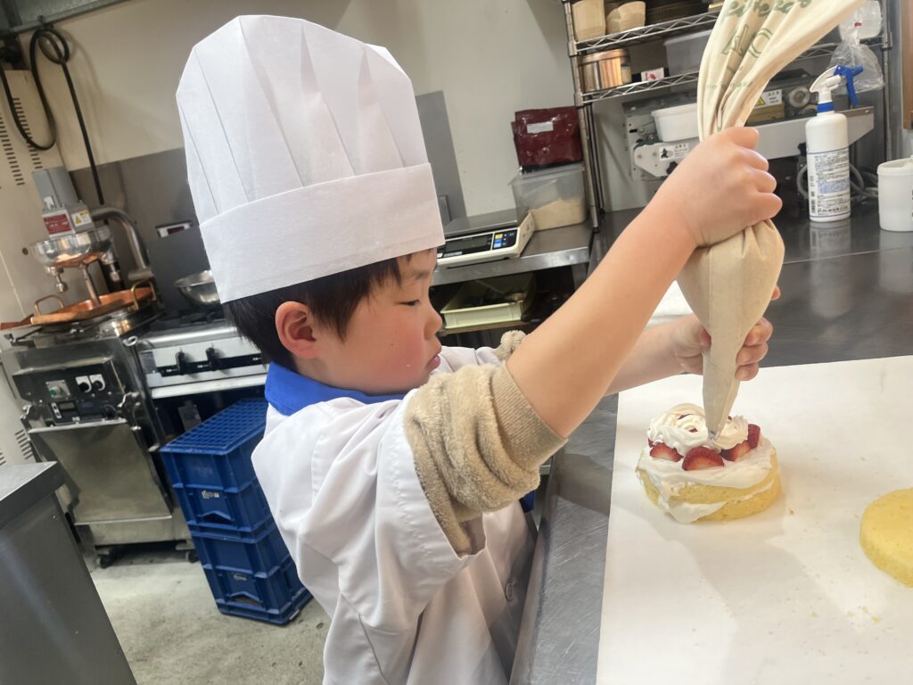 ちっびこパティシエの日記 いつき君7歳 2026.02.21 この記事は約1分で読めます。 いつきくん7歳が ケーキ作りに初挑戦*\(^o^)/* 弟の2歳のバースデーケーキを 作りに来てくれました🎂❤️ ケーキが真っ白になっていく様子を 「うわぁ❤️」と、 感激してくれる、いくき君 いきいきとケーキ作り 楽しんでくれましたね😊 抱っこの弟さんのご機嫌が 途中、悪くなってきましたが いつき君がコック帽子で 顔を隠していないいないばあ🫨して あげる姿が頼もしいお兄ちゃんでした❣️ 農家さんからいただいた変わった形の 特大いちごを真ん中に乗せて、 とっても素敵なケーキが完成!